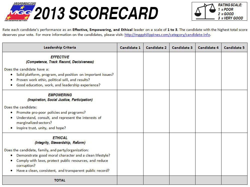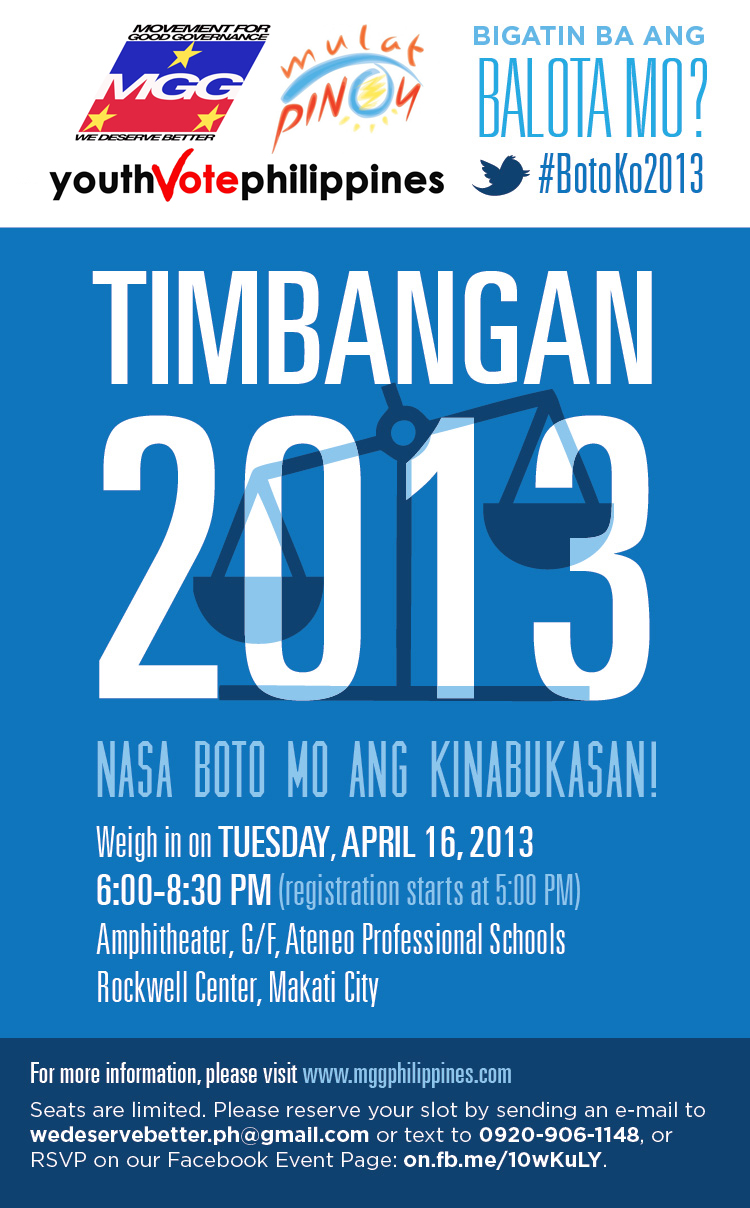 The Movement for Good Governance (MGG), together with Youth Vote Philippines and Mulat Pinoy, invites all concerned citizens to Timbangan 2013, an exercise in evaluating the 2013 senatorial candidates. Do those seeking office meet MGG’s criteria of effective, ethical, and empowering leadership?