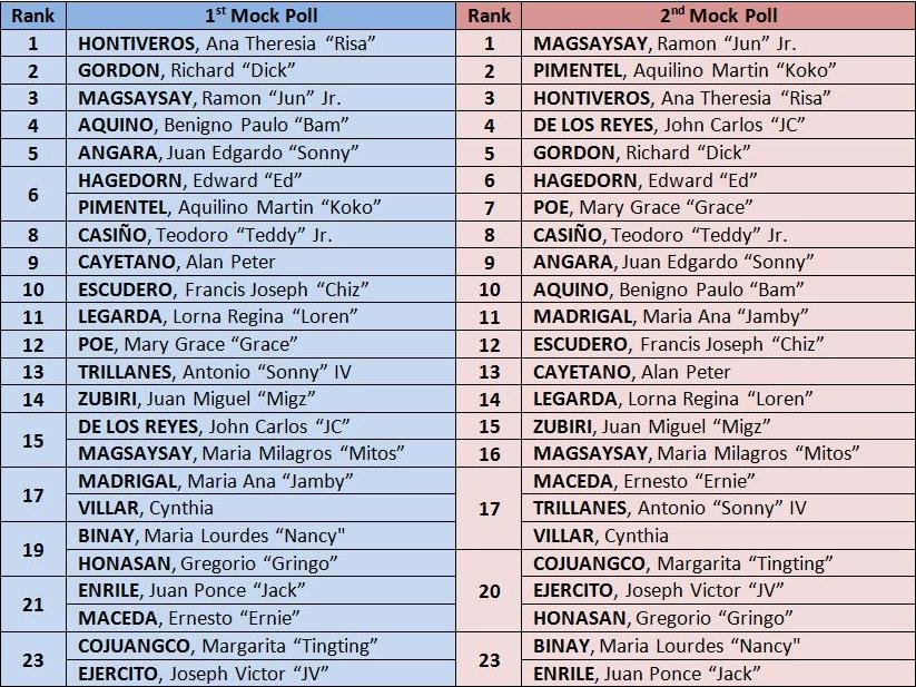 Former Senator Magsaysay became the number one choice and Former Senator Jamby Madrigal, and JC delos Reyes formed part of the favorites. Bam Aquino and Sonny Angara dropped in the ranking of voters.